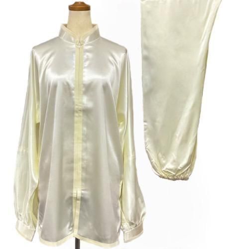 胸までファスナータイプで被りタイプです。袖口は、手軽なマジックテープ留めです。ポリエステル製の光沢の美しいサテン生地です。手軽に洗濯可能です。太極拳の表演服は通常1ヶ月半〜2ヶ月程かかりますが、こちらは在庫商品ですのでご注文後、数日で発送が可能です。